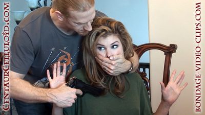 The kidnapper proceeds to rope Candle to the dining room chair. Her hands are tied behind her, her bare feet are bound and tethered to the chair legs. Ropes are wrapped around her chest, securing her to the chair back. For a more dramatic effect and incentive, Candle’s cleave-gagged with a really thick green cloth. Now our blonde housewife is tightly chairtied, her nips poking through her long Tee!