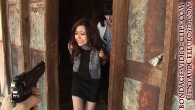 You send Chloe on an errand to go back to the car and get your cigarettes. Natasha is left alone, strictly hogtied with scarves, and wriggling right at your feet! You enjoy the show, but then Chloe returns. You turn your gun on her and tell her to get down on her belly next to Natasha! She complies, and we cut to Chloe also strictly hogtied (with rope), cleave-gagged and blindfolded right next to Natasha! Both tied-up secretaries struggle and wriggle all about on the hard floor of the old, abandoned barn.