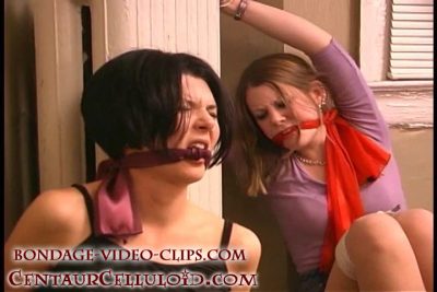 100% Pantyhose Bondage Mini-Movie! 17 minutes! 3 plotted scenes! This video is from the Centaur Celluloid VHS release, “The Process.” First, we have the cutie-pie, blonde Miranda Capulet handgagged and wrestled to the floor by villain Quinn K. He’s after something he believes is in her possession. Miranda ends up handcuffed to a radiator. Tied-up next to her is the hot goth chick, Lydia Lyles. Both damsels are cleave-gagged and their ankles are bound.
