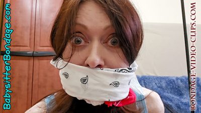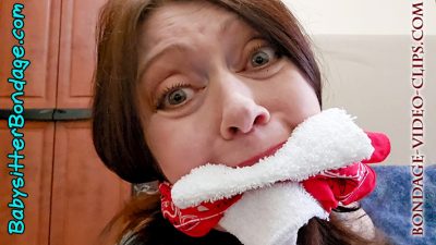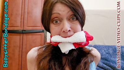 Now this is where Aunt Natasha decided to give this kid some lessons in gagging. After all, no one want to go to jail! “This OTM gag doesn’t work well at all, I can totally call out for help!” She demonstrates and tells him to try a different gag. She’s cleave-gagged next, but that’s not very effective, either. She demonstrates again and says he needs to find a gag that actually works. So next Aunt Natasha gets a washcloth stuffed in her mouth! This gag works a lot better than the last two. Everything she says is pretty muffled. But after lots of animated gagtalking, Natasha laughs and spits it out! It was a good try, but still not good enough. She’s not gagged at all now! Go try again!