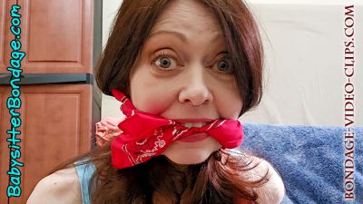 So Aunt Natasha gets a fourth gag! Another bandanna is added on top to make a triple gag! She tests it out with lots of mmphing and gag-talking. She tells her nephews that after four tries, the neighborhood boy finally gave her a pretty good gag. You can barely understand her muffled chatter as she promises to tell you more even more tie-up stories and they’re even better than this one! Wow! You can’t wait!
