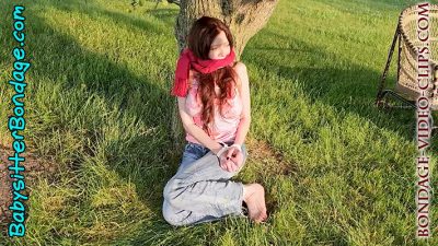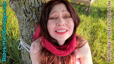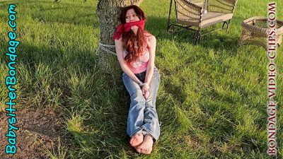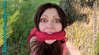 You think she’s just teasing, so you run off to get your brother and tell him he has to find Aunt Natasha that you have all tied up and gagged, hidden somewhere. Poor Aunt Natasha is left all alone in that huge yard, bound seated to a tree with the biggest gag ever! After a while, she starts to wonder if you’re ever coming back to let her loose. Eventually you come back. Aunt Natasha is so happy! She pulls her gag down. “My hero! I’ve been rescused!” Until the next game, that is…!