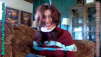 At the end of the game, Aunt Natasha pulls the blindfold off, then spits the packing gag out. “Wow! You did a really great job!” she says. Natasha laughs and smiles as she tells you how much fun this game was and she can’t wait to play again all week long! Wow! A whole week of your Aunt Natasha in sweater bondage, tied up with scarves and gagged with socks. And blindfolded, too! Oh my, you think you’ll just die and go to heaven!