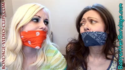Then MILF Natasha returns home. She’s in a long sundress and also barefoot. She finds the beautiful babysitter all tied up by her son for his little bondage game. She thinks it’s cute, so she decides to play along, too! She puts up her hands for this “robber” in the house. Now both mom and babysitter are tied up together, side by side and barefoot, on the coffee table. They’re now OTM gagged with bandannas, too! They struggle and gag talk playfully, sometimes over-dramatically, sometimes giggling, but always very seriously entertaining!