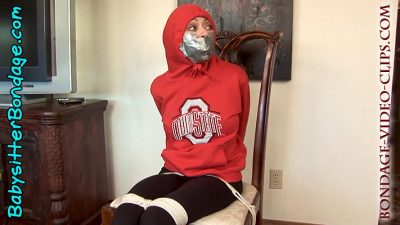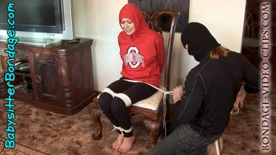 FULL HD! Babysitter Natasha Flade is at a week-long gig. She’s in her hoodie and leggings, all ready to go jogging. But a masked man is at the door and chases her! Trapped in the living room, Natasha throws her tennis shoes at him. But it only slows him down and he grabs and handgags her. She’s dragged to a chair and tightly roped there: hands tied behind the chair back, knees and ankles tied. The thief adds lap ropes, then tethers her bare feet to the chair rungs.