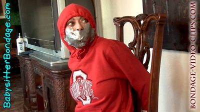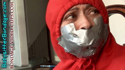 He just wants to enjoy her delicious cookies in peace, so he wraps miles of duct tape all about her head! Poor babysitter Natasha is getting panicky. The crazy cookie thief finally leaves, but the kids are nowhere to be seen! She’s struggling vigorously, determined to free herself and escape! The viewer is treated to varied camera angles and views. The closeups of Natasha’s damsel eyes and strictly taped-up face are especially delightful as she gag talks and pleads into the camera, hoping the kids will hear and come rescue her!