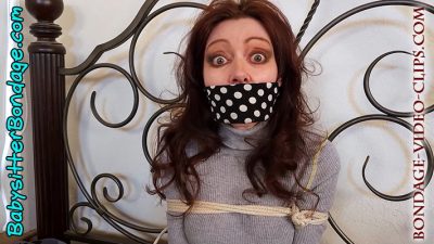 Natasha is still tied up, but now there’s a stock stuffed in her mouth! She gag-talks how she can’t believe you gagged her with a dirty sock! She pretends to be annoyed at first, then laughs at your crazy ideas. You’re just glad she went along! So next she gets a polka dot bandana as an OTM gag over the sock. Natasha talks through her gags – and then you run off and leave her like that!