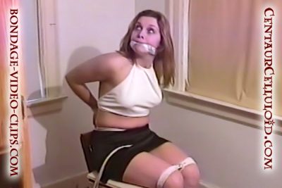 Vintage 1998 VHS Footage Re-Edited from the Source Tapes! Cutie blonde Andrea is being held for ransom! She’s been chairtied in her miniskirt and sexy, open-back, halter top. Her captor also has her cleave gagged with a white bandanna. Our pretty, young, damsel is looking really nervous and afraid as her captor, Isaac, through his bandanna mask, is talking to her father via the ransom tape he’s making. The kidnapper makes his demands, then turns off the camera to go and wait for the ransom to arrive.
