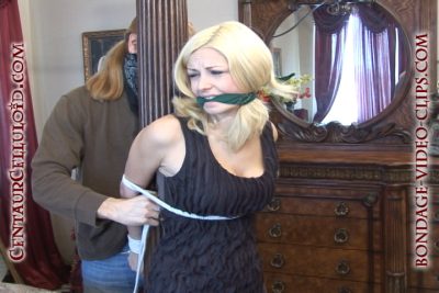 CLASSIC BONDAGE VIDEO from 2009 RE-EDITED Blonde bombshell Danielle Trixie was making the bed in her black dress and high heels when a masked robber comes in and grabs her by the face at gunpoint! Poor Danielle is handgagged and dragged over to the tall bedpost where she’s ordered to get up against it and put her hands together behind it. The helpless blonde can’t do nothing else but allow her slender wrists to be tied tightly together behind that post.