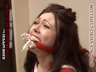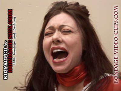 Natasha manages to spit out her gag and starts screaming for help. Her kidnapper, Isaac W., hears her and comes rushing in and handgags her. He tells her to best not try that again, she’s really pissing him off. He refolds that huge wad and forces it back into Natasha’s mouth, then she’s left alone once more. Natasha’s getting frantic now. Her struggles become more intense. Is no one coming to save her?