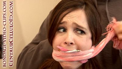 He tells her that he knows her boyfriend stashed a shitload of cash in this house, and she’d better tell him where to find it! Poor Mallory claims to not know what he’s talking about. Fine. He stuffs her mouth with cloth and wraps it in with a thick scarf. Now she’s packing gagged and wrap gagged — and much more quiet! She’s forced to the floor where her elbows are strictly bound, followed by her beautiful bare feet, then she’s finally hogtied. He leaves to search the house himself, leaving the helpless captive alone to struggle on the carpet. We’re treated to great shots of Mallory’s soles, her thong-covered ass and lovely gagged face as she’s writhing about and sobbing through her double gagging.