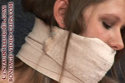 Natasha ropes Daphne tightly to the chair. Her ankles are bound and tethered to the chair legs, then lap ropes are added to keep her secure. Natasha gets the judge on the phone and keeps Daphne handgagged while she tells him how things are going to go down. She makes Daphne beg her father to please save her, then Daphne’s handgagged again while Natasha relays the rest of her demands. Then Daphne’s mouth is stuffed with cloth then a long ace bandage is wrapped over that. Daphne is much quieter now!