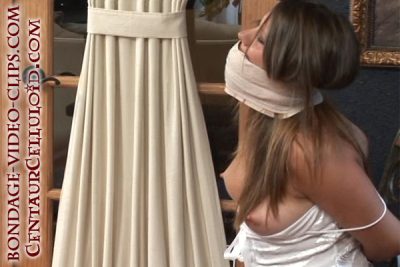 But Natasha’s not finished! She pulls down Daphne’s silk top so we see her perfect, perky boobs. Then Natasha takes some phone photos of her all bound and gagged – and topless! This will motivate her dad to do what’s required! Natasha exits the room to send off the pics to the judge. Poor Daphne is left alone to struggle in her bondage like the roped-up damsel in distress she is!