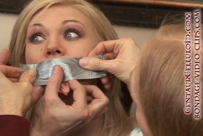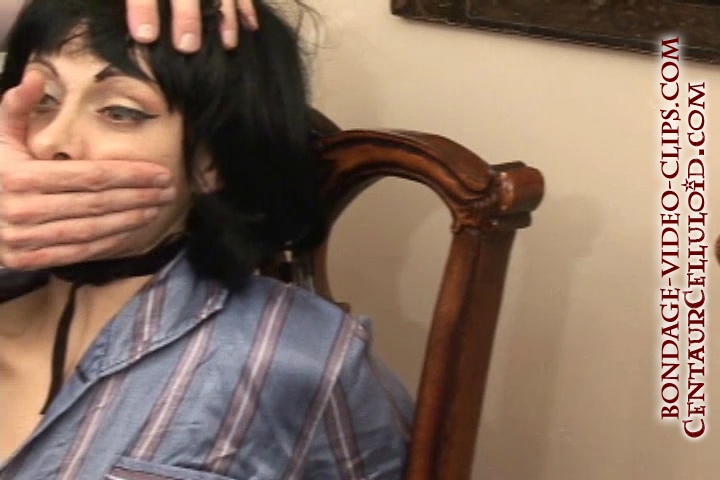 Loren Chance and Chloe Night had to call in a geek squad to help with their broken laptop. It’s morning, and Loren is still in her pajamas, Chloe in a sexy, silk nightgown. Both ladies are barefoot and seated on chairs while they distress over their failed computer. In response to their call, two computer tech geeks (Sergio and Isaac W.) arrive to attend to the repair job. The two guys stroll into the room, all professional. Or so it seems. While Isaac takes the laptop, Sergio pulls out a gun and orders the scared damsels to keep their asses on the dining room chairs. He keeps the two girls at gunpoint as Isaac ties Chloe’s hands behind the chair. Then the two “IT” geeks switch and Isaac holds the gun as Loren while Sergio binds her wrists behind her chair back, too. Needless to say, the two girls are quite upset about this whole situation, especially when the geeks laugh and explain that their main job isn’t computer repair, it’s robbing innocent women who let them into their homes! This brings a round of protest from the now-tied chix. They’re getting just a bit too loud, especially Chloe, who keeps desperately trying to convince them to stop and finally resorts to trying to call out for help. These two pretenders can’t have that! Isaac stuffs a wadded-up silk scarf into Chloe’s mouth and then layer upon layer of duct tape is plastered to her face to keep the scarf in her pretty mouth. Now both packing gagged and tapegagged, the wide-eyed blonde damsel Chloe has at last been silenced! Not much sound is going to make it through all that gagging! Meanwhile, Sergio has been keeping Loren firmly handgagged until Isaac can make it over to her with more cloth and his huge roll of duct tape. Sergio forces Loren to open her mouth for the wadded-up black cloth that Isaac now shoves into her unwilling mouth. Sergio holds onto Loren’s head to keep her still as she’s tapegagged by Isaac with strip after strip of the silver tape over her lips. What a difference! Their captives are so quiet now! All that’s to be heard is their pitiful mmpphs and mews from behind the packing and tape! Now these two geeks can finish trussing them up! More rope is pulled out of their bag, which they use to rope the damsels’ bare feet with. Loren’s ankles are tied together, Chloe’s are bound spread apart to opposite chair legs, and we discover that the naughty blonde isn’t wearing any panties underneath that slinky nightgown! Finally, lap ropes are applied to finish the job. With their hot captives now tightly chairtied, the IT guys decided they want to have some fun before they leave. They smirk and exchange glances. “Ahh, are you thinking what I’m thinking?” Isaac asks. “You are!” Laughing, set to playing with their beautiful, chair-bound damsels. They unbutton Loren’s pajama top and start groping and fondling her tits. Sergio even licks and sucks on her nipples! Chloe isn’t spared in this escapade! Her creamy breasts are fondled and felt up, too. Sergio even pats Chloe’s exposed pussy, which results in a series of muffled shrieks! The two imposters just laugh at their poor victims’ horrified expressions and attempts to wriggle free from their touch. Eventually, Sergio and Isaac decide they best take off before anyone finds them. After all, it’s Christmas time and the girls claims they’re having guests over later for a party. Won’t they be amazing when their guests arrive and find them all tied topless and gagged! Chloe and Loren don’t share this sentiment; as soon as these “IT” geeks leave, they both starts struggling to get free from the bondage they now find themselves in! Their tits jiggle as they struggle about; we’re treated to lots of great angles, including closeups of their tape gagged faces and wide, damsel eyes, along with some shots of Chloe’s shaved pussy as her nightgown’s hiked up. Includes some fab behind-the-scenes footage, including Chloe drinking a glass of water while chair-tied as Sergio holds the cup to her lips! This 15:15 minute long bondage video is a must-have for any lover of chair-bound damsels!