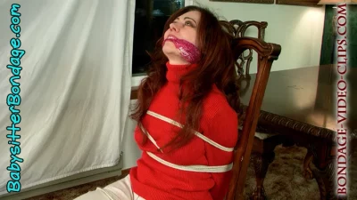 RE-EDITED WITH NEVER-BEFORE-SEEN FOOTAGE & HIGHEST PICTURE QUALITY! Natasha Flade, the hot office mom, is chairtied in her red turtleneck sweater, slacks (pantyhose underneath) and spiked high heels. It’s sweater bondage time for mom! You have a camera set up and you make her plead into the camera like it’s a real ransom video to be sent to her husband so he’ll cough up the loot for this damsel! Natasha puts on a good show for the ransom tape, her eyes wide as she pleads and begs for someone to please rescue her! After she’s done telling the camera about her tied up predicament, she asks you if she made it right. You tell her she did great, but right now it’s gag time!