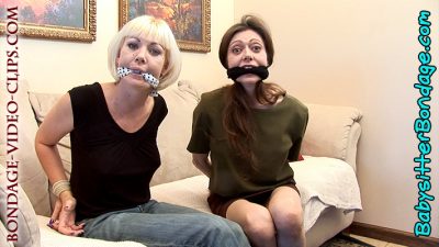 Then Natasha’s son wants to try out the lessons on mom! Natasha didn’t expect this, but she agrees and crosses her hands behind her back. Now mom Natasha is bound hand and foot right next to babysitter Chloe. She tries to get loose as a test of her son’s tying skills and finds that she’s stuck — she taught him well! Now he wants to practice the gag on her, too! After some encouragement by Chloe, Natasha agrees and gets a thick scarf wrapped between her lips. So here’s mom and babysitter both tied up and cleave-gagged on the sofa together! They wriggle around and gag talk, laughing and having a good time.