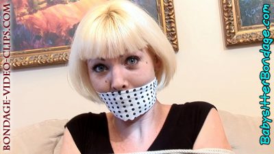 FULL HD! Epic COMBINED Babysitter Bondage & MILF Bondage Clip! Blonde babysitter Chloe Night is bound hand and foot on the sofa for a game. She’s barefoot and wearing jeans, hands tied in front and tethered to her legs, ropes around her chest, ankles tied together. She’s OTM gagged with a bandana. Chloe really puts on a good damsel show with loud “MMMs,” gag talk and playful struggling.