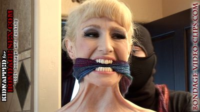 Then the intruder pulls out two thick scarves. Natalie is cleave gagged not once, but twice, she’s double gagged to keep her extra quiet. He forces her to her knees. As her ankles are tied, we can see her beautiful bare feet and soles. Next, her thighs get some rope, too. Natalie was hoping this wouldn’t happen, but we all knew what was coming.