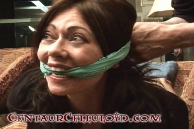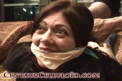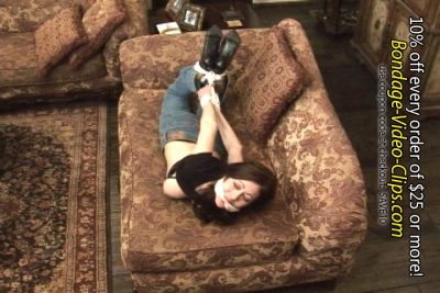 Classic bondage video from 2009! Brunette damsel, Natasha Flade, was quietly reading a book on the chaise all alone at home. She’s relaxing in her t-shirt, jeans and ankle high black boots. But she’s taken by surprise when a masked robber sneaks up behind her and grabs her! Natasha is handgagged by the thief, who then proceeds to keep her out of his way by roping the helpless damsel into a a tight hogtie. To muffle her cries, Natasha is double cleave gagged with two bandannas!