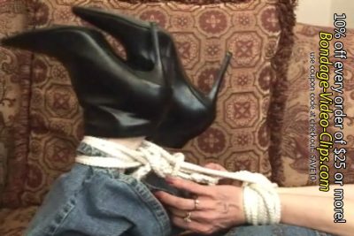 But the robber gets all beside himself at the sight of his captive bound and gagged so helplessly. He decides to help himself to just more than Natasha’s valuables in the house, and pulls her t-shirt up and starts to grope and fondle the damsel’s lovely tits. Our masked thief finally manages to pull himself together and takes off to rob the place, leaving Natasha hogtied and gagged all alone. She seizes this opportunity to try to break free from her bonds, and starts to struggle hard in her efforts to escape before the thief returns. We are treated to plenty of great closeups of Natasha’s bound boots, as well as her cleave gagged face. That ass looks mighty fine, too, in blue jeans, and there are plenty of good aerial shots of Natasha struggling while hogtied topless in her jeans and ankle boots!