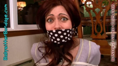 Then you two boys ask if she’d mind being gagged, too. At first Natasha protests. But you keep begging, so she finally relents. But she has a few rules! No duct tape and nothing in her mouth, either. That doesn’t leave much, does it?! You’re left gagging her with an over the mouth scarf. And she gives you a time limit, too. Your Mom is really adamant that your tie-up game ends in exactly five minutes.
