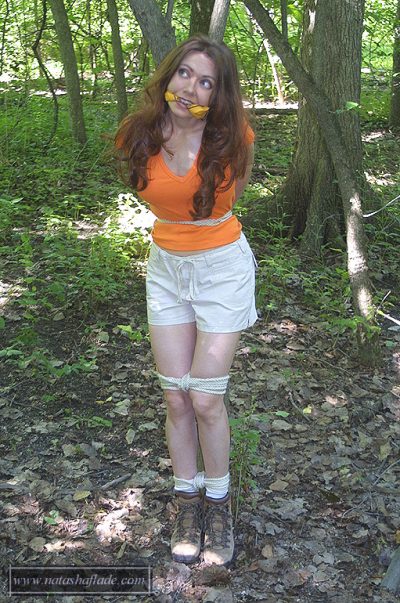 Natasha also has a boyfriend whose son, Davy, is a cub scout. Natasha decides to assist him with his knot tying practice. The result is that this damsel ends up tied to a tree outdoors and cleave gagged with a cub scout neckerchief!.