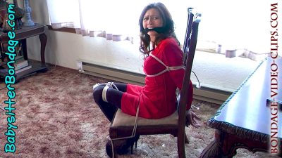 Hmm, that does sound relaxing! Natasha happily plays along and soon finds herself roped to a dining room chair in her red secretary dress, black tights and spiked high-heels. She tests her bonds a bit, but mostly she just relaxes. It’s a very comfortable chair-tie! She laughs and smiles a lot and remarks that she’d love to sit her all tied up like this and let her boys make dinner and do the dishes every day!