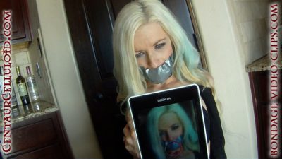 She’s complaining, so it’s gag time! You stuff her mouth with a really big white cloth, and hold that packing in place with layers of duct tape. This blonde babe is tightly chair-tied and tapegagged, all silent now, except for soft mewing. A lap rope is added to secure her to that chair, then you get out your phone and take the first pics of helpless Danielle to send to her father.