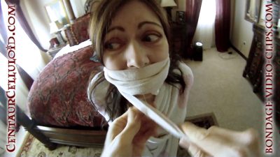 You stuff her mouth with a huge cloth, then she’s strictly wrap gagged with a long ace bandage on top. You pull her robe open to expose her fine tits! You take that gun and run it along her breasts just to keep her scared and within your control. More ropes are wrapped about her breasts and the bed post. She’s not going anywhere now and is at your mercy!