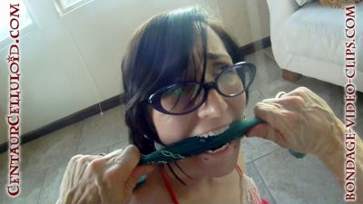 You take your roll of duct tape and put it to good use! Quimm’s hands are taped crossed behind her back. Her bare feet are crossed and taped up next. Then she’s cleave gagged, not once, but twice! This double bandana gag is really thick, just the way you like it! Next, you wrap the sticky business around her lovely, bare thighs. Quimm is now quite immobile in this tape bondage you’ve got her in.