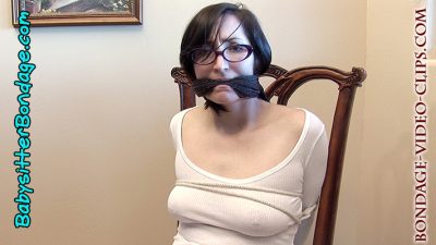 NOW IN FULL HD! Cutie pie babysitter Quimm Anaheim (the one with nerdy eye glasses!) is in charge at a boys’ sleepover. She’s barefoot and in pajamas when she’s approached by the gang about playing a little game. They want to tie her to that chair she’s sitting on! Quimm laughs, but then agrees and holds out her hands to be tied in front of her. Those boys do quite a good job of getting their nerdy babysitter thoroughly chair-tied. They leave her barefoot, but apply lots of tight ropes above and below her tits, making her nip right out through her flimsy pajama top! Quimm puts on a good damsel in distress show for the gang of boys, but when she protests that this tie-up game should be ending soon, the boys run off and just leave her tied up to her chair!