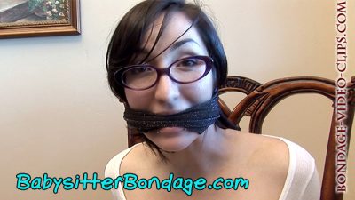 Now Quimm is getting REALLY angry. Especially when she catches one of the boys staring at her big tits, which they can’t help but notice through her flimsy top! (There’s lots of great closeups of her big boobs and nipping out!). She calls the boys naughty little perverts, but that doesn’t get her untied. No, they leave her there, chair-tied barefoot and double cleave-gagged! Quimm is struggling for real now and yelling out in angry gag talk. It doesn’t look like our naive, nerdy babysitter with glasses will be getting any sleep tonight!