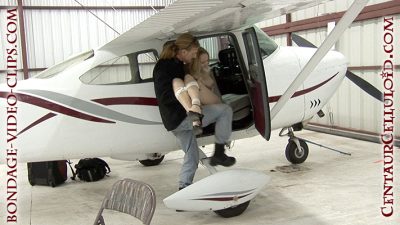 Sara is carried (the first bondage carry in this video!) from the car, tied up topless in high heels and double cleave-gagged with two layers) and sat down on a chair. She’s tightly chairtied so the kidnapper pilot can run the checklist before tossing the bound and gagged damsel into the back for her plane flight transport!