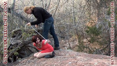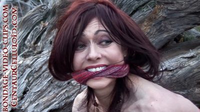 FULL HD! Secretary Natasha Flade has been kidnapped from her office! She’s forced to walk through the wilderness all tied up in her office wear: red dress, pantyhose and spiked high heels. Her hands are bound behind her and she’s been silenced with a thick double-wrapped cleave gag. Her abductor forces our damsel to sit on the ground next to a log. Her hands are stretched out behind her and attached to that log in strappado fashion. Then she’s left alone while he attends to some kidnapping business.