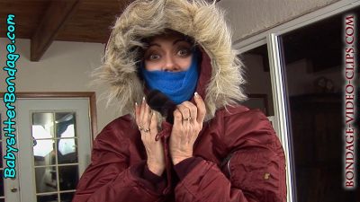 “What a wonderful tutor!” you think. Natasha struggles for you like a real damsel. After a while, you let her loose — except for all that gagging! You want her to remove it herself. So Natasha stands and poses with all her gags still on. At your request, she pulls up her parka hood, twirling around and showing off how sexy she is with her long legs in her pantyhose and black ankle boots.