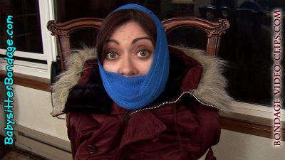 Soon our teacher finds herself all tied up to her chair in her parka and miniskirt. Then all that gagging is added in layers. First, white socks are stuffed in her mouth, then a soft scarf as a cleave gag over that. But then her student goes too far! He takes the whole roll of vet wrap tape and and wraps it around her entire head and face! Poor Natasha is triple gagged, her head wrapped — and very thoroughly silenced!