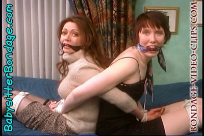 We cut to them tied up back-to-back on the bed, the gags still on their mouths. Their legs (in pantyhose!) bound above the knees and at their ankles. It’s a sight you’ve dreamed of forever! You leave your bound and gagged captives to struggle. You hear them gag-talking about you, out of character, and you holler for them to get back to mmphing like the damsels they are! And they do! They struggle like that, tied up together, until they fall over on the bed! They start calling for you through their gags! You have to rescue them from their fallen position!