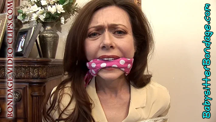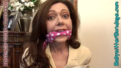 You’ve been hiding in a corner watching with great pleasure this whole time! But now you come back and tell her that since she’s being too noisy, she has to be gagged. “What’s this about gagging me? I never agreed to that!” Natasha exclaims. But you don’t listen! And your Aunt soon finds herself cleave-gagged with a pink, polka dotted bandanna! She’s not very happy about this to say the least. But you just run off and leave her all tied up and gagged.